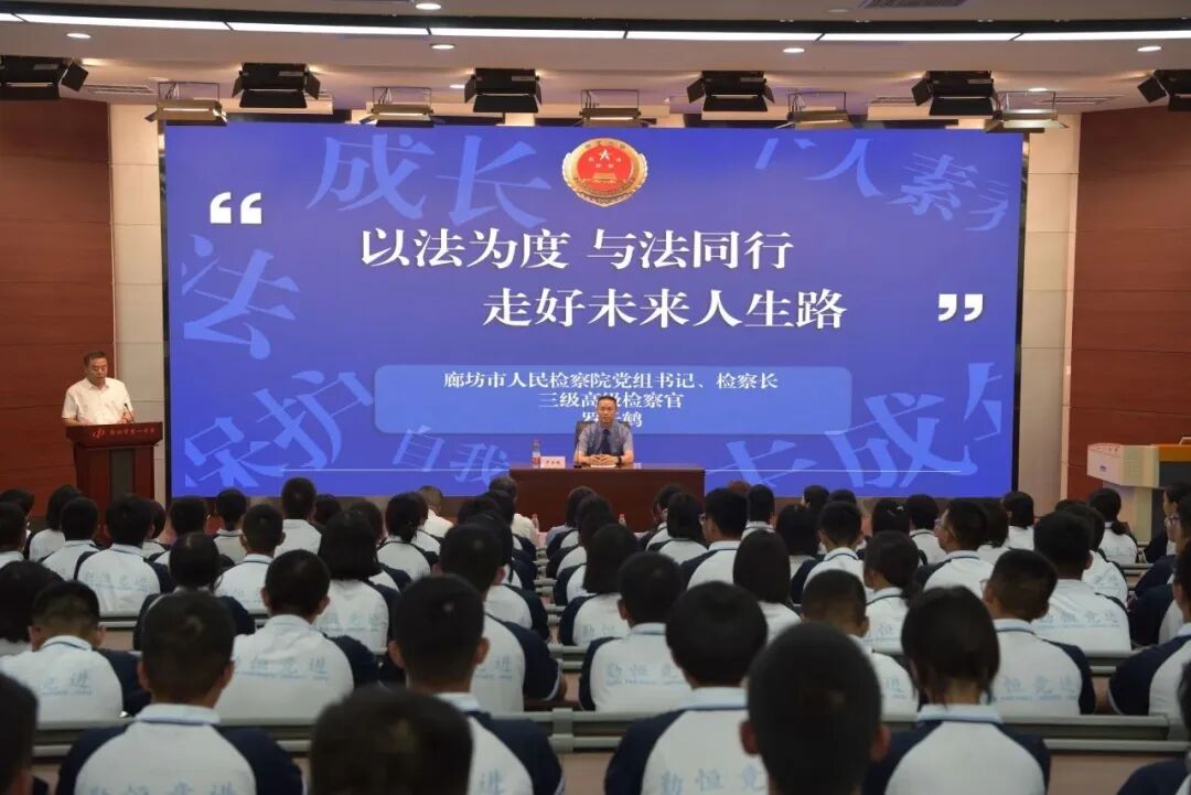 护航青春,逐梦未来。9月7日下午,廊坊市检察院党组书记、检察长罗云鹤以法治副校长的身份再次走进廊坊市第一中学,以“以法为度 与法同行 走好未来人生路”为题,为全体高一新生讲授了一场内容丰富而又精彩纷呈的法治课,让同学们在步入高中学习生涯之初,接受法治的熏陶,感受法律的威严。