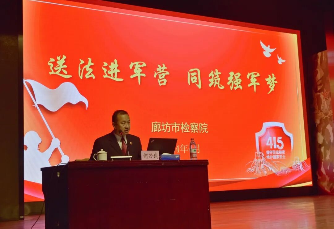 活动开始后,廊坊市检察院向部队赠送了《中国式现代化面对面》、《国家数据安全知识百问》、《国家安全法律法规汇编》等法律书籍;而后,廊坊市检察院第二检察部副主任何乃武以“了解国家安全常识,强化国家安全意识”为主题,结合自身工作经验和国家安全典型案例进行了精彩的普法宣讲,进一步拓展了官兵关于什么是国家安全及如何维护国家安全的相关法律知识。