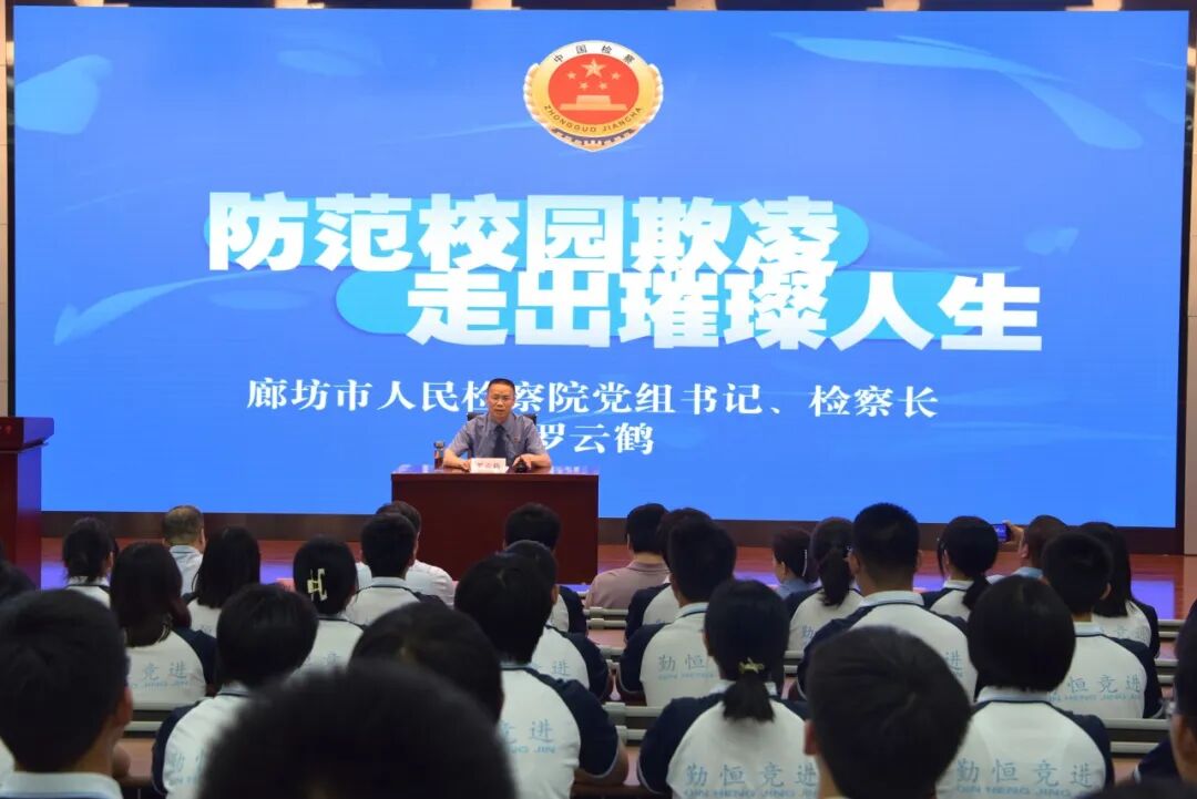 6月27日晚,廊坊市人民检察院党组书记、检察长罗云鹤再次以法治副校长身份走进廊坊市第一中学,以“预防校园欺凌,走出璀璨人生”为题,为高一、高二1600余学生讲授了一堂生动的法治课。
