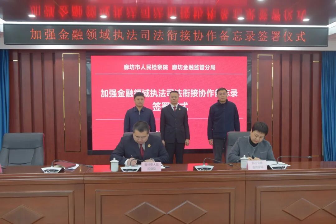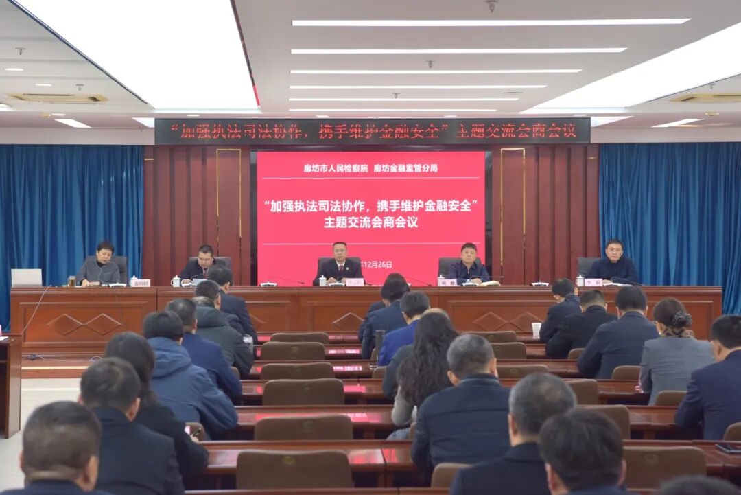 为进一步建立健全金融领域执法司法衔接协作机制,凝聚金融检察与金融监管工作合力,依法惩治和预防金融犯罪,维护金融安全,共同服务保障金融高质量发展,12月26日,市检察院与廊坊监管分局以“加强执法司法协作 携手维护金融安全”为主题,举行工作交流会商会议,并签署了《加强金融领域执法司法衔接协作备忘录》。廊坊监管分局党委书记、局长周懋,市检察院党组书记、检察长罗云鹤出席会议并讲话。