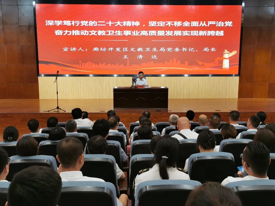 知学践行二十大,踔厉奋发新征程。中共廊坊开发区文教卫生局委员会在廊坊法治宣教中心召开庆“七一”党员大会。