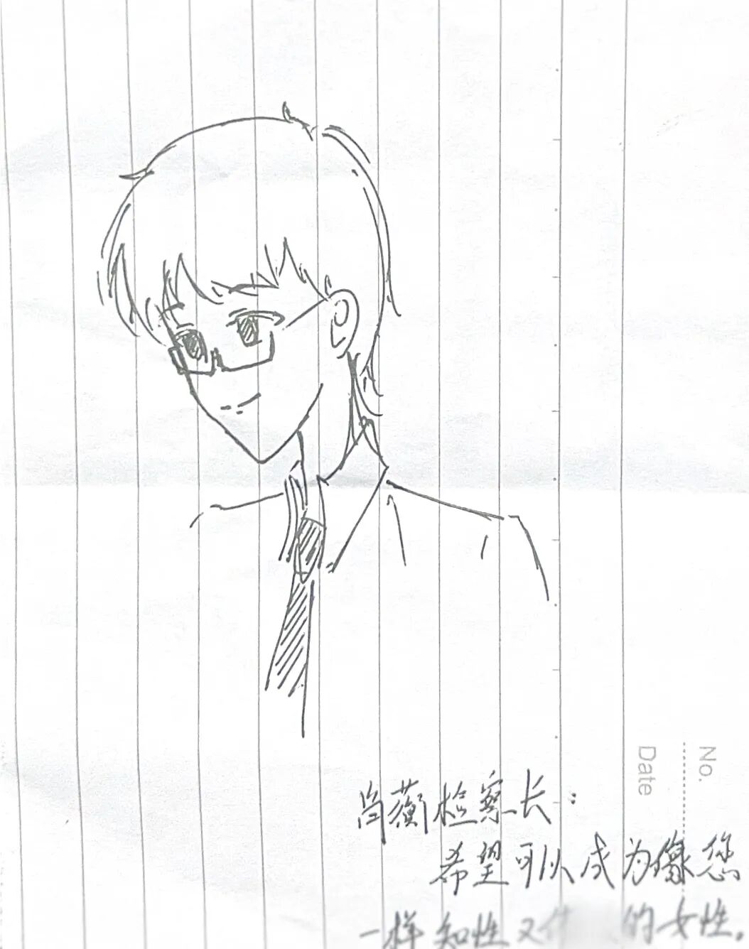 “这堂法治课,改变了我的决定,我以后也要立志成为您这样的检察官!”法治课结束后,廊坊市第一中学的一名高一女生在报告厅门外,向肖蘅检察长赠送亲手绘制的肖像,并写下了自己的心愿。