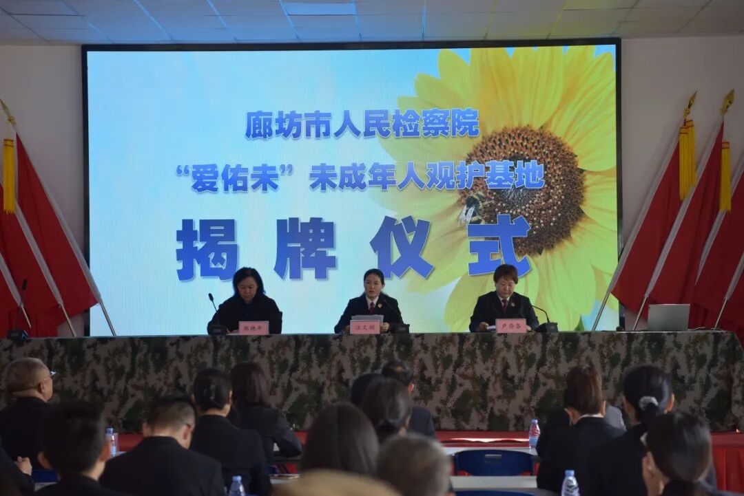 揭牌仪式上,参加活动的相关人员在品诺社工带领下,从未来孩子们学习的军事教育展览馆、观护帮教心理咨询室到宿舍、食堂,对观护基地进行实地查看,检察机关与社工组织在观护基地多媒体教室进行了座谈并签署协议。最后,市院副检察长汪文娟代表廊坊市人民检察院揭下牌匾红布,廊坊市“爱佑未”未成年人观护基地正式揭牌成立。