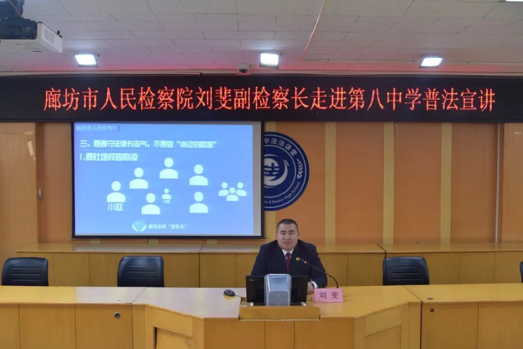 冉冉晨雾重,晖晖冬日微。为落实好检察官担任法治副校长制度,以司法保护促进校园安全和学生法治教育。11月22日上午,廊坊市人民检察院党组副书记、常务副检察长刘斐以法治副校长的身份再次走进廊坊市第八高级中学,为高一年级150余名师生讲授了一场生动的法治讲座,帮助同学们强化法律意识、加强守法自护。