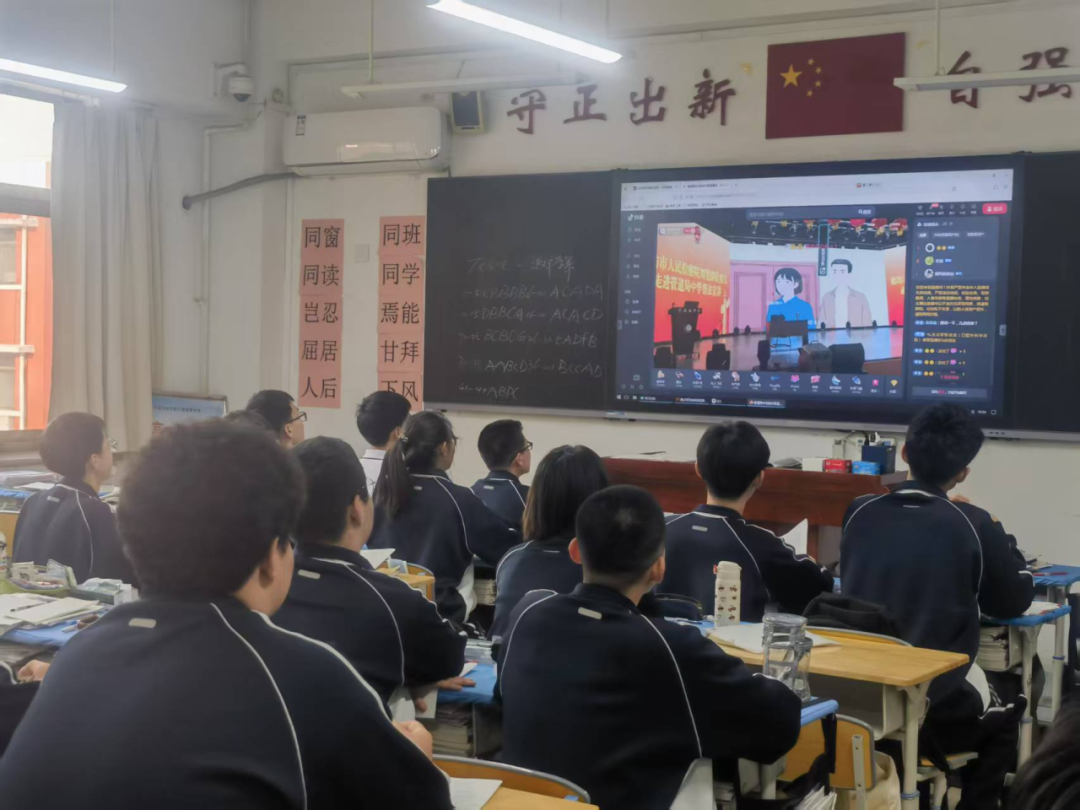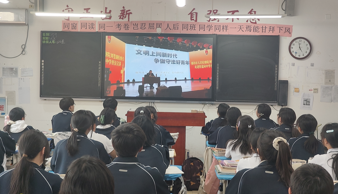 随后,刘斐又从正面为同学们讲述文明上网的方法,教会大家如何利用好互联网这一学习“法宝”,坚持文明上网,不触碰法律底线,守护清朗环境,争当网络小卫士。每一句网络留言都是个人形象的镜子,每一次点击转发都是价值选择的答卷。法治课的最后,刘斐呼吁广大青少年,“以拳拳赤子心,筑巍巍强国梦”。