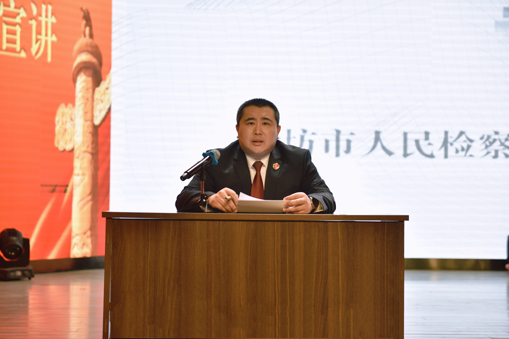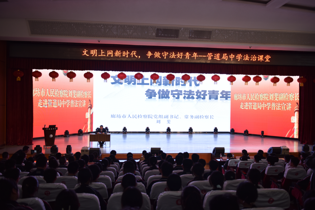 初春和风吹满地,校园普法进行时。3月24日下午,廊坊市人民检察院党组副书记、常务副检察长刘斐以法治副校长身份,走进廊坊市管道局中学为全体师生讲授了一场生动的法治讲座。此次课程在全校使用抖音APP同步直播。