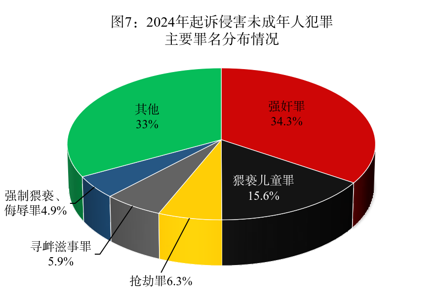 (2)侵害未成年人犯罪案件主要涉及五类罪名。2024年,全国检察机关起诉侵害未成年人犯罪人数较多的罪名包括:强奸罪25558人、猥亵儿童罪11650人、抢劫罪4717人、寻衅滋事罪4418人、强制猥亵、侮辱罪3627人,五类犯罪人数合计占起诉侵害未成年人犯罪总数的67%。