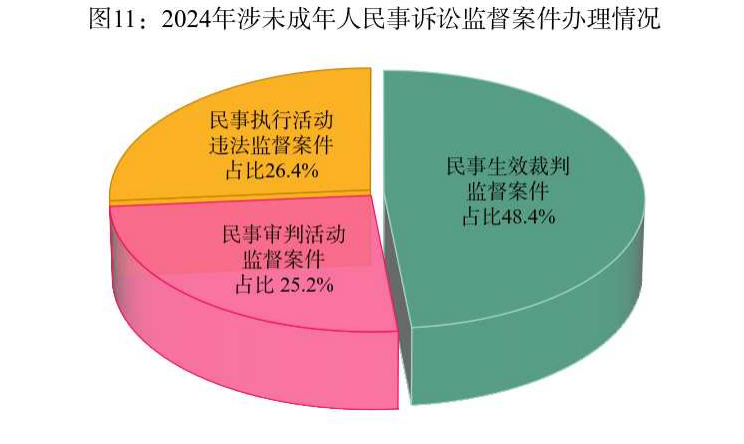 3. 开展民事案件审判监督和执行活动监督情况。2024年,全国检察机关共办理涉未成年人民事诉讼监督案件725件,其中民事生效裁判监督案件351件,民事审判活动监督案件183件,民事执行活动违法监督案件191件。对民事生效裁判提出再审检察建议12件,提出抗诉4件。对民事审判活动违法情形提出检察建议171件,对民事执行活动违法情形提出检察建议162件。